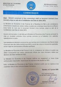 Face aux rumeurs persistantes sur les réseaux sociaux et dans certains médias, le ministère de l’Économie et des Finances a publié, le mardi 27 janvier 2026 à Bamako, un communiqué officiel pour démentir toute annonce liée au lancement imminent d’une monnaie unique de l’AES, la Confédération des États du Sahel.